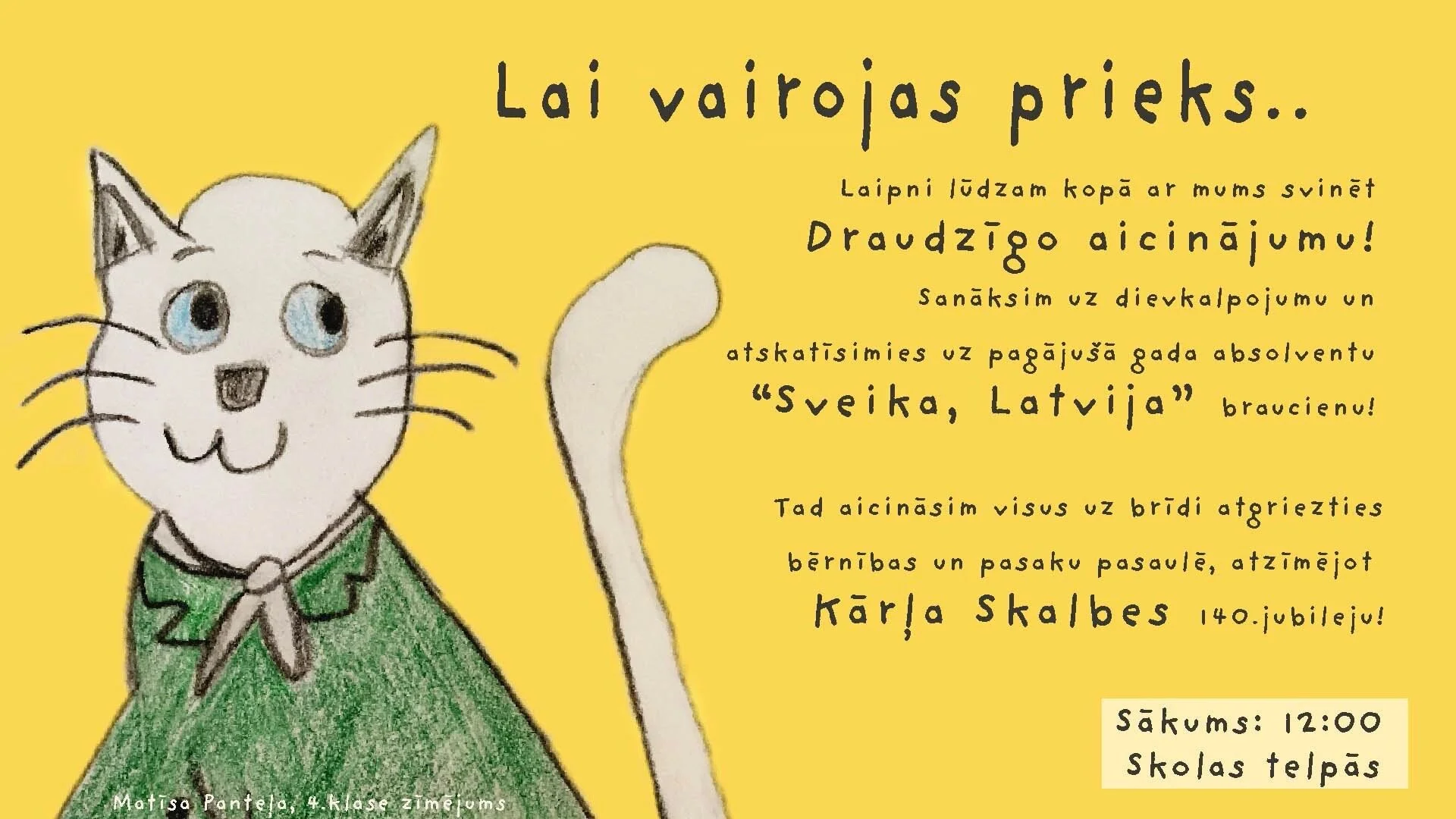Selp absolventu atskats uz “Sveika, Latvija!” ceļojumu un literārā daļa “Pasakķēniņš ciemā nāk”, veltīta K. Skalbes 140. jubilejai.