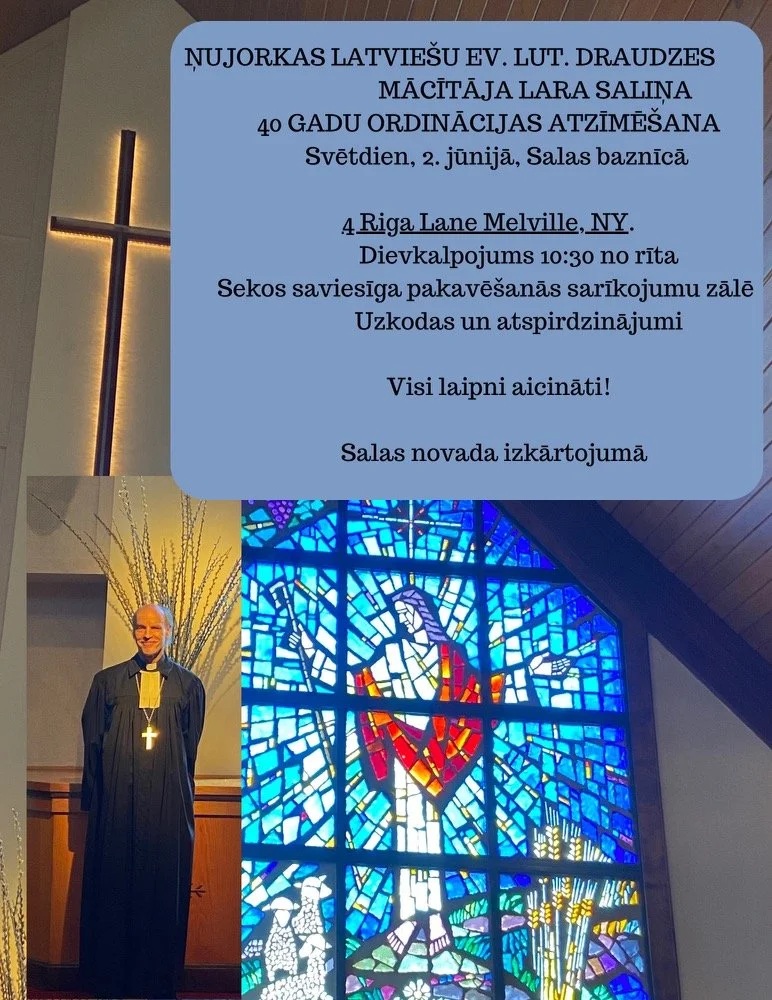 Dievkalpojumam seko mācītāja Saliņa 40 gadu ordinācijas jubilejas atzīmēšana. Sekos saviesīga pakavēšanās sarīkojumu zalē. Būs uzkodas un atspirdzinājumi. .